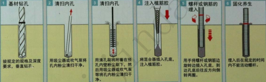 5、植筋所用的锚固胶必须是合格产品,各项性能指标要符合规范要求。